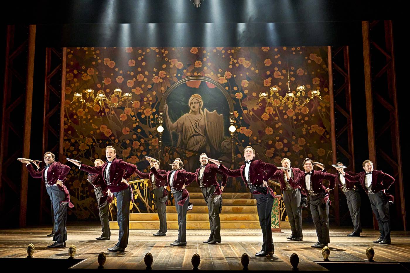Rounding out the cast are Leo Abad (ensemble), Craig Armstrong (Manny/ensemble), Lindsay Artherton (ensemble), Gemma Atkins (ensemble), Alan Bradshaw (Louie/ensemble), Jabari Braham (Harry/ensemble), Kevin Brewis (ensemble), Jenni Bowden (Onstage swing), Daisy Boyles (Onstage swing), Samara Casteallo (ensemble), Olly Christopher (Onstage swing), Brendan Cull (ensemble), Hayley Diamond (Onstage swing), Jacqueline Hughes (ensemble), Ashlee Irish (ensemble), Jodie Jacobs (Ernestina/ensemble), Shirley Jameson (Mrs. Rose/ensemble), Paul Kemble (Rudy/ensemble), Emily Langham (Ermengarde/ensemble/female dance captain), Michael Lin (Ambrose/ensemble), Amira Matthews (ensemble), Laura Medforth (ensemble), Matt Overfield (Stanley/ensemble), Tom Partridge (ensemble), Wendy-Lee Purdy (ensemble), Edwin Ray (Onstage swing/male dance captain), Phil Snowden (Danny/ensemble), Kraig Thornber (Judge/ensemble), Gavin Wilkinson (Onstage swing), Liam Wrate (Hank/ensemble).