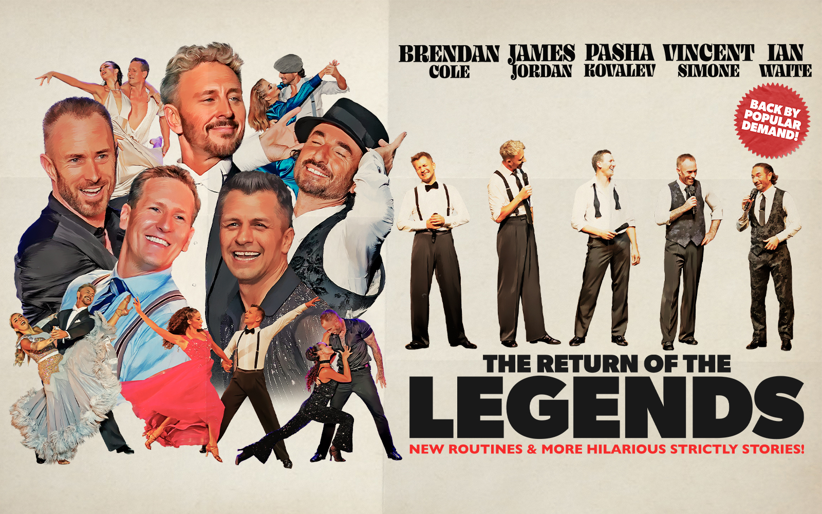 Brendan Cole, James Jordan, Pasha Kovalev, Vincent Simone and Ian Waite, together with a supporting cast are back to create another evening of spectacular dancing, hilarious camaraderie, great music and a huge amount of laughter! They have all headlined their own solo tours but together they create what one journalist described as “a show that was nothing short of spectacular.”