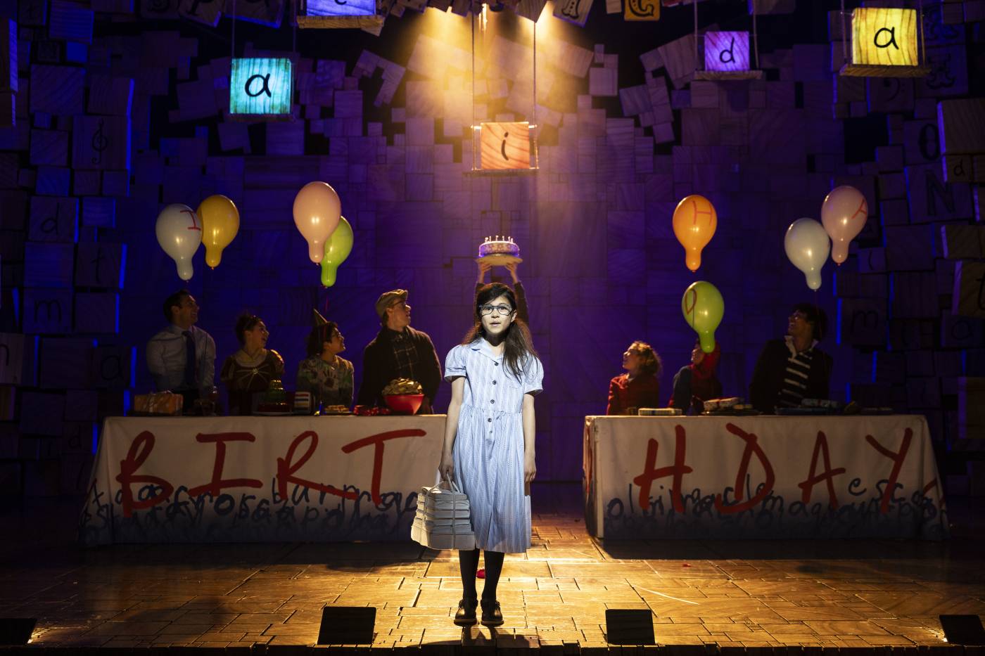 Matilda The Musical features flashing lights, lasers and loud sound effects. Latex balloons are popped onstage and stage haze (smoke) is used. Throughout the performance actors interact in audience spaces.